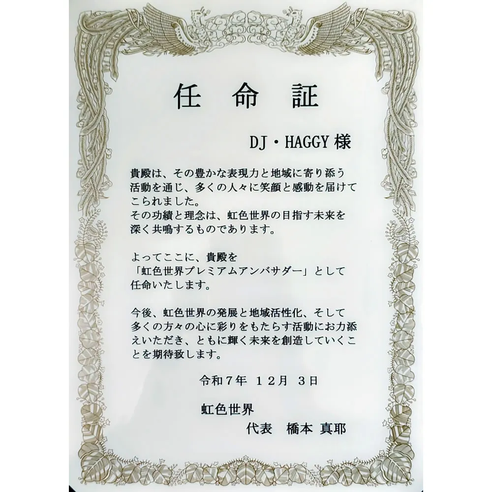 ★2025年12月3日水曜日・大安に、DJ・HAGGY【虹色世界プレミアムアンバサダー】任命になりました。