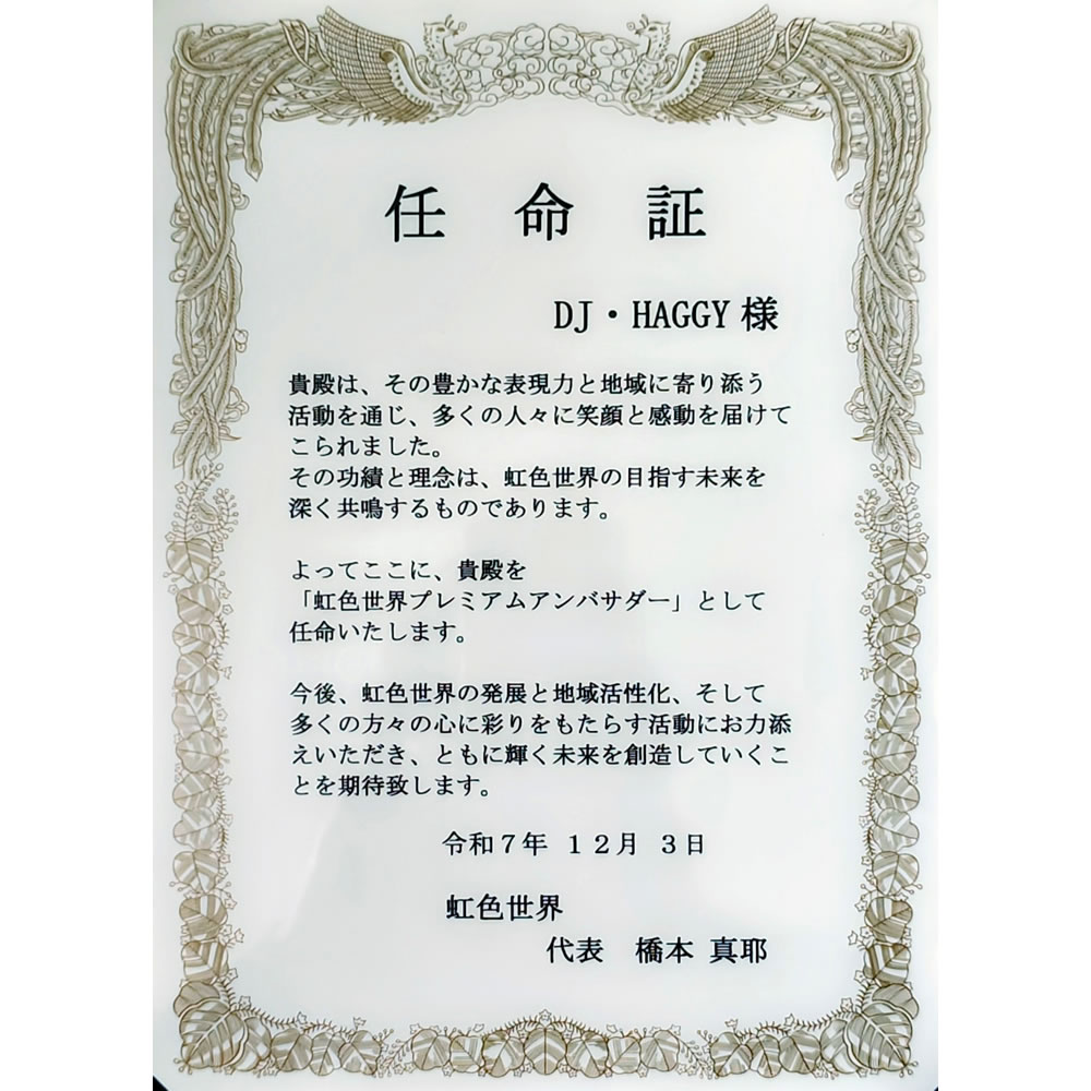 ★2025年12月3日水曜日・大安に、DJ・HAGGY【虹色世界プレミアムアンバサダー】任命になりました。
